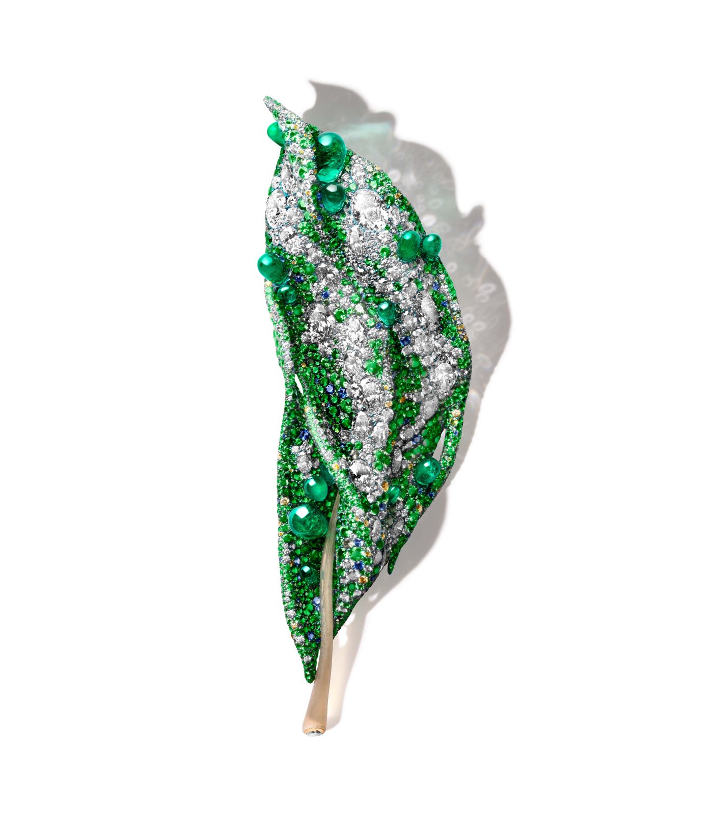 2025 Black Label Masterpiece II 大師系列 落地生根胸針,作品以自然生命的循環為靈感,透過多層次立體結構與白、綠雙色寶石的漸層排列,演繹葉片自墜地、生根、萌芽的生命循環。