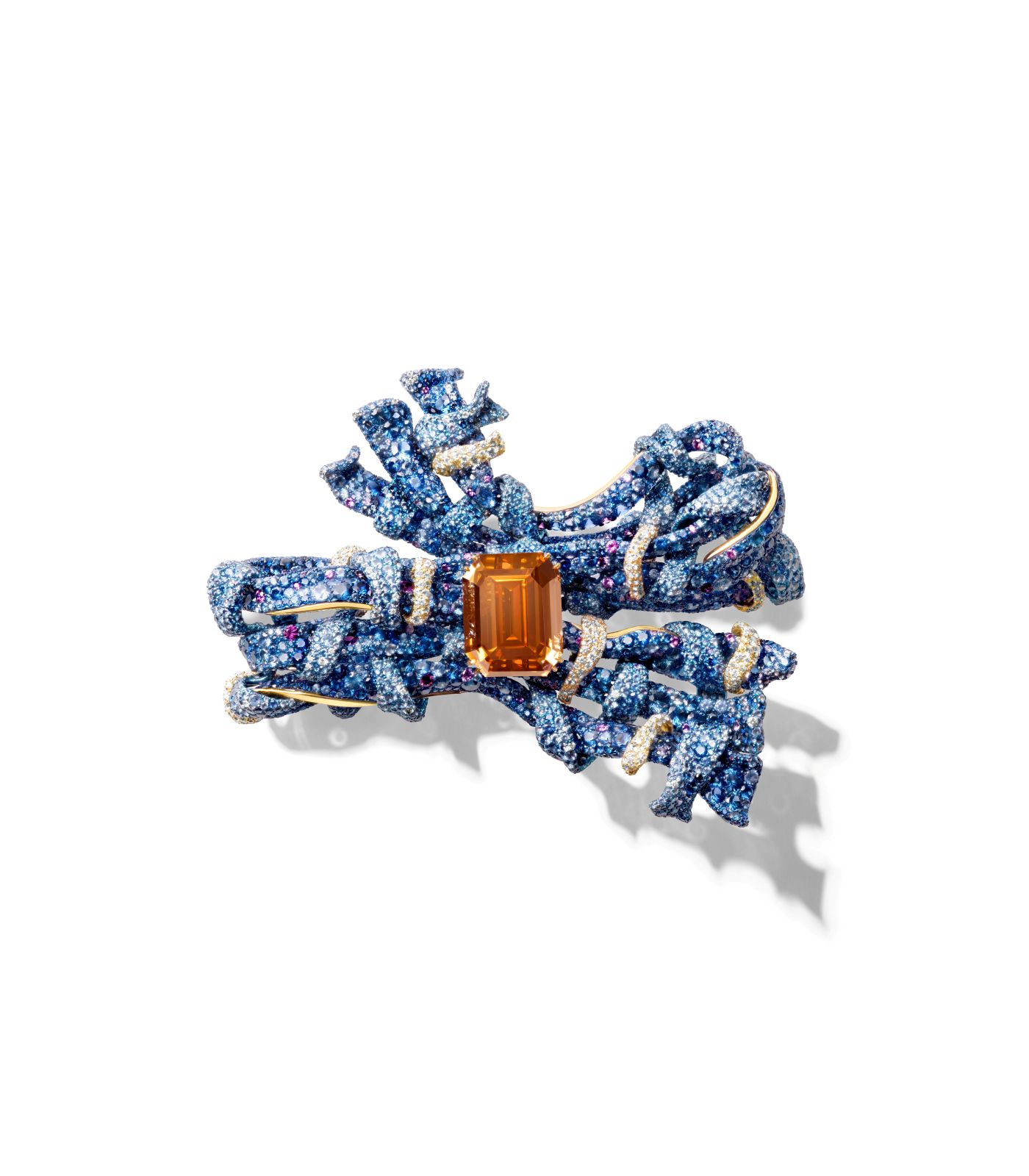 胸針中央鑲嵌一顆重達 25 克拉、VVS2 淨度的祖母綠切割橘棕鑽,周圍環繞著共 6,774 顆寶石,構成超過 21 種色階的光譜漸層:四組藍色與三組紫色的三階漸變,輔以金色鑽石的閃耀與鈦金屬的微光,譜出宛如織物的色彩交響。