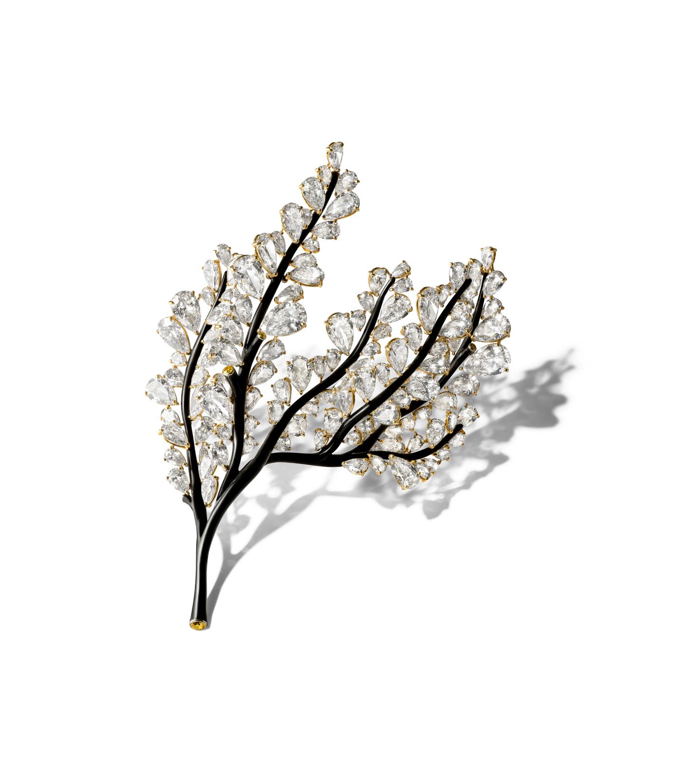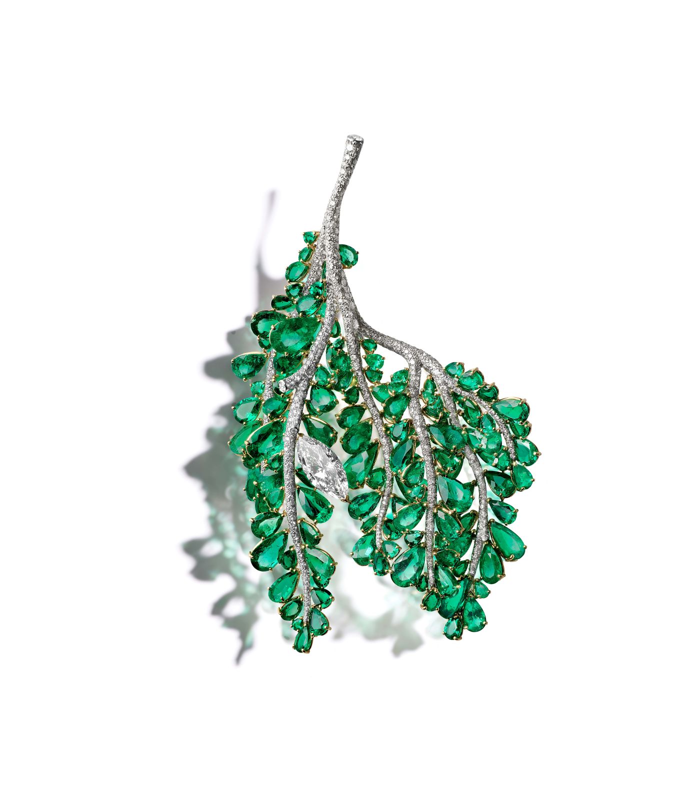 「四季系列  樹枝胸針」主石:3克拉馬眼 D/IF 白鑽,配石:祖母綠、白鑽 18K白金、 18K黃金,共1394顆寶石 、總重61.46克拉。作品中啟用高科技創新材質──HyCeram陶瓷漆,其精美如鏡面光滑的完美表面,都是工匠耗費時間潛心研磨後的結晶。