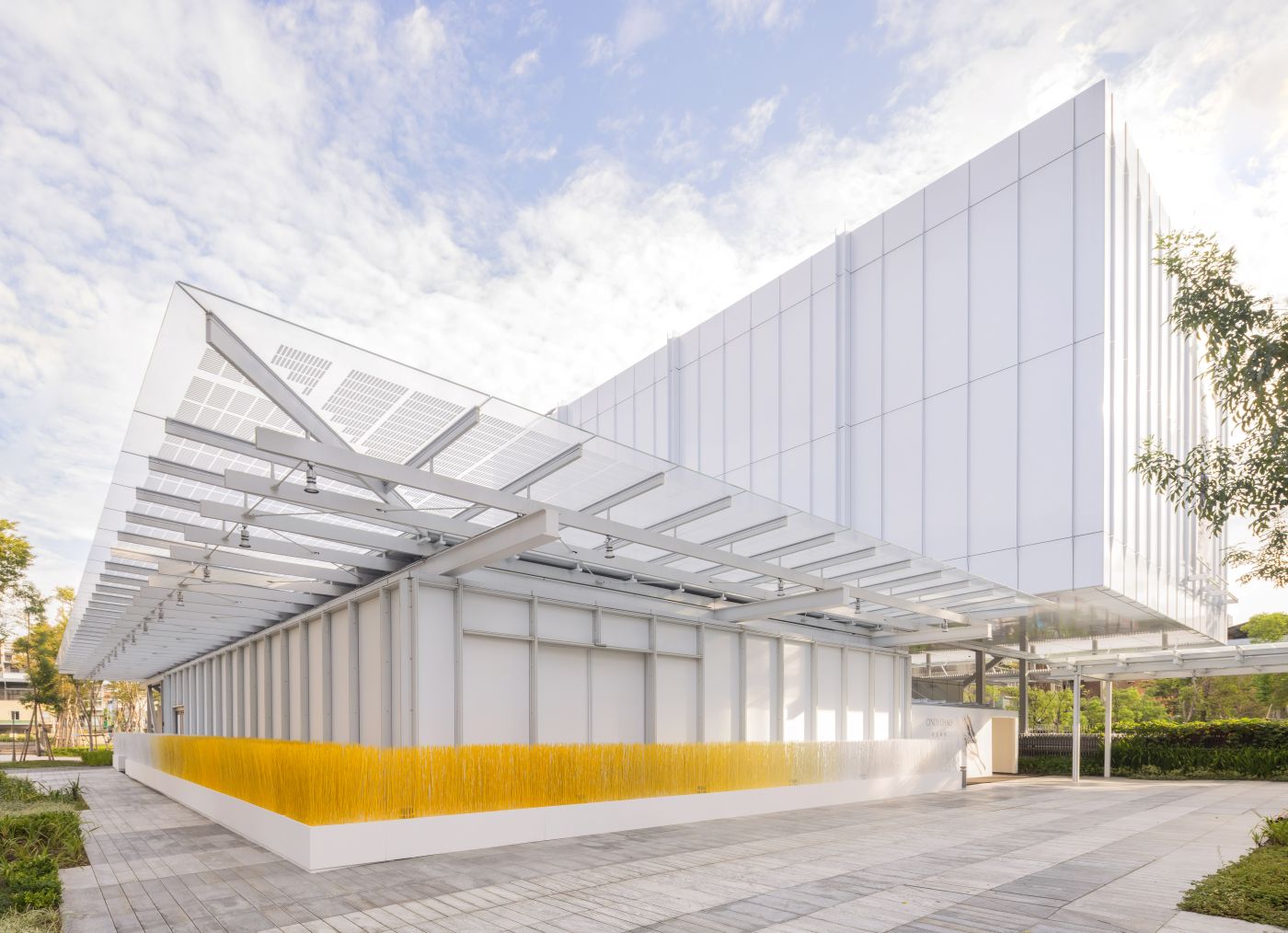 CINDY CHAO《時光築藝 Sculpting Time》展覽於富邦美術館附屬商業棟揭幕,入口以游文富創作的竹藝裝置〈陽光〉迎接觀者,白至金黃的漸層色調象徵清晨破曉的希望與能量,呼應展覽以光影與時間為主題的空間敘事。